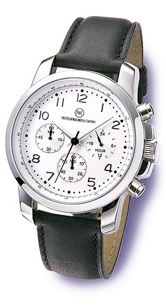 Sportlicher Metall-Chronograph; Gehäuse glänzend plattiert; wasserdicht 3 bar; kratzfestes Mineralglas; Stoppuhrfunktion; 24-Stunden-Anzeige. Dieser Chronograph ist auch in Damengröße, mit schwarzem Zifferblatt oder gegen Aufpreis mit Edelstahl-Armband erhältlich. Lieferung in Geschenkverpackung.