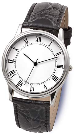 Eine unserer Uhren mit klassischem Charakter. Im polierten flachen Gehäuse, dessen elegante Ausstrahlung der  Index mit römischen Zahlen wunderbar unterstützt. Falls Ihnen das Echtleder-Armband mit der Kroko-Prägung nicht gefällt, tauschen wir es gerne zum Beispiel gegen ein flaches ohne Naht.