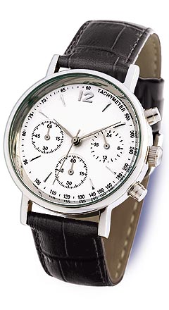 Poliertes Edelstahl-Gehäuse, wasserdicht 5 bar; Stoppuhr-Funktion;  24-Stunden-Anzeige. Dieser Chronograph ist auch mit schwarzem Zifferblatt oder sportlichem Echtleder-Armband ohne Narbung lieferbar. Natürlich inklusive Geschenketui.