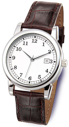 So wie diese Armbanduhren, die als Werbepräsente Ihre besondere Wertschätzung transportieren. Die gediegene Ausstrahlung und hochwertige Ausstattung mit solide verarbeitetem poliertem Edelstahl-Gehäuse (3 bar wasserdicht), gewölbtem Mineralglas, silber-glänzenden Zeigern sowie wahlweise mit schwarzem oder braunem Echtleder-Armband begeistern nicht nur ausgewiesene Uhren-Freunde.