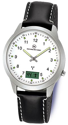Wie bei unseren anderen funkgesteuerten Armbanduhren kommt auch bei diesem Modell die gleiche Technik mit analoger Stunden-Anzeige und kleinem Display für Datum und Sekunden zum Einsatz. Die Vorzüge von funkgesteuerten Armbanduhren genießen Sie also auch mit diesem Modell. Das Einstellen der aktuellen Zeit geschieht ebenso automatisch via DCF77-Signal wie das Umstellen zu Beginn von Sommer- oder Winterzeit. Mattes Edelstahl-Gehäuse 5 bar wasserdicht, Armband aus Echtleder, Lieferung in Kartonetui.