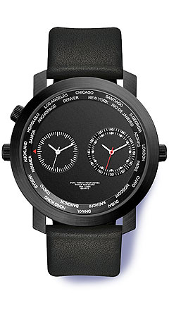 Die schwarze Version unseres Modells 8307. Die Ausstattung beider Uhren ist gleich, und sie sind jeweils mit schwarzem oder silber-mattem Zifferblatt erhältlich. Neben der Anzeige von zwei Zeitzonen ermöglicht ein innenliegender Drehring, den geografischen Bereich zu markieren, auf den die zweite Zeitzone eingestellt ist. Metall-Gehäuse 3 bar wasserdicht. Lieferung inklusive Geschenketui.