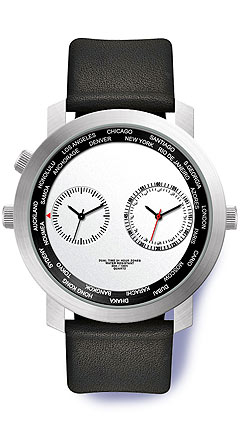 Auch bei diesen sportlichen Uhren sind die Anzeigen der zwei Zeitzonen auf dem Zifferblatt übersichtlich angeordnet. Um die 2 Zeitzonen leichter unterscheiden zu können, ist die rechte Anzeige mit einem roten Sekundenzeiger und fluoreszierenden Stunden-Markierungen ausgestattet. Semi-matt gebürstetes Metall-Gehäuse 3 bar wasserdicht. Lieferung inklusive Geschenketui.